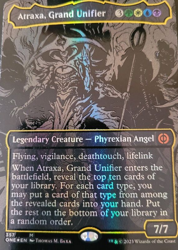 Atraxa, Grand Unifier's Magic: The Gathering cards are available in at least 1 sets. Atraxa, Grand Unifier's biggest 7-day price movers are 2023 Phyrexia: All Will Be One #357 Foil (Oil Slick Raised Foil), 2023 Phyrexia: All Will Be One #316 Foil (Showcase), and 2023 Phyrexia: All Will Be One #316 Base (Showcase).