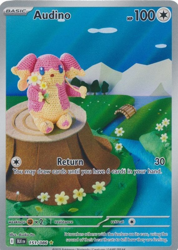 Audino's Pokemon cards are available in at least 12 sets. Audino's biggest 7-day price movers are 2012 Japanese Black & White: Freeze Bolt #053/059 1st Edition, 2012 Japanese Black & White: Dragon Blast #047/050 1st Edition, and 2025 Scarlet & Violet: Journey Together #124/159 Base.