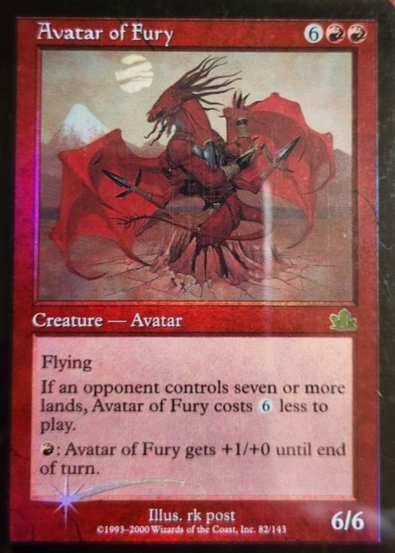 Avatar of Fury's Magic: The Gathering cards are available in at least 1 sets. Avatar of Fury's biggest 7-day price movers are 2000 Prophecy #82 Foil.