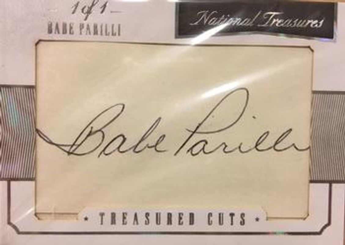 The biggest 30-day change Babe Parilli cards are 2015 National Treasures #CUT-BP Treasured Cuts /1, 1951 Topps Magic #4 Base, and 1959 Topps #107 Base.