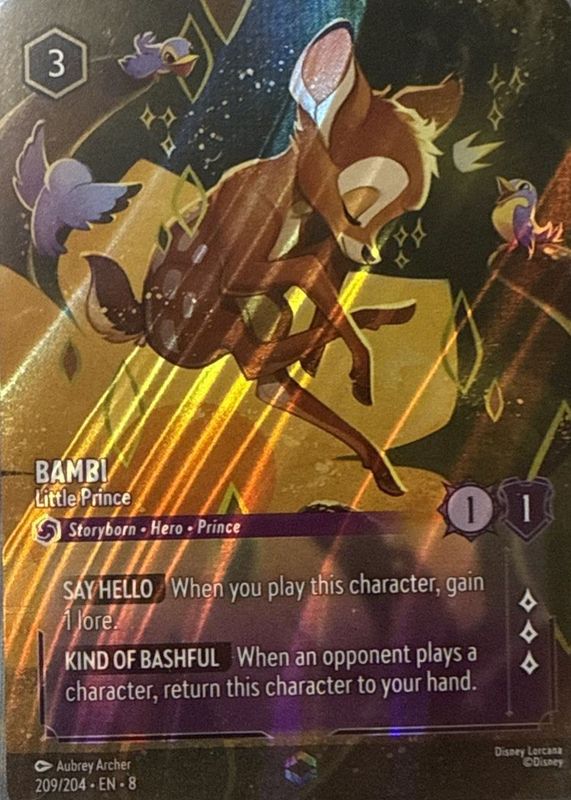 Bambi - Little Prince's Disney Lorcana cards are available in at least 1 sets. Bambi - Little Prince's biggest 7-day price movers are 2025 Reign of Jafar #209/204 Enchanted (Alternate Art), 2025 Reign of Jafar #63/204 Cold Foil, and 2025 Reign of Jafar #63/204 Base.