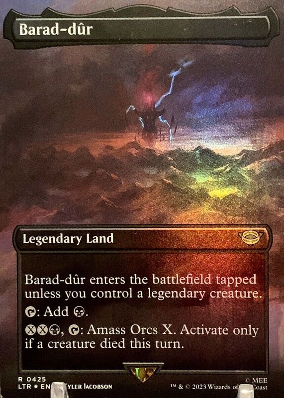 Barad-Dur's Magic: The Gathering cards are available in at least 1 sets. Barad-Dur's biggest 7-day price movers are 2023 The Lord of the Rings: Tales of Middle-Earth #425 Foil Borderless, 2023 The Lord of the Rings: Tales of Middle-Earth #425 Base Borderless, and 2023 The Lord of the Rings: Tales of Middle-Earth #340 Base Showcase.