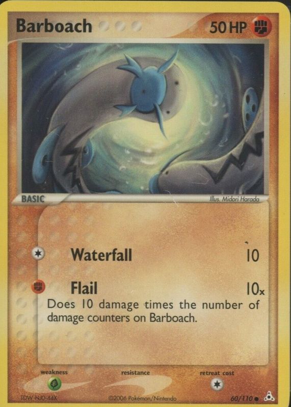 Barboach's Pokemon cards are available in at least 10 sets. Barboach's biggest 7-day price movers are 2014 Japanese XY: Tidal Storm #018/070 1st Edition, 2003 EX: Dragon #51/97 Reverse Holo, and 2006 EX: Holon Phantoms #060/110 Reverse Holo.