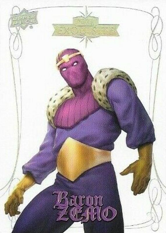 Baron Zemo's Marvel cards are available in at least 16 sets. Baron Zemo's biggest 7-day price movers are 2016 Upper Deck Marvel Gems #4 Exquisite (/199), 2023 Upper Deck Marvel Platinum #154 Printing Plates Cyan /1, and 2023 Upper Deck Marvel Platinum #154 Cosmic /25.