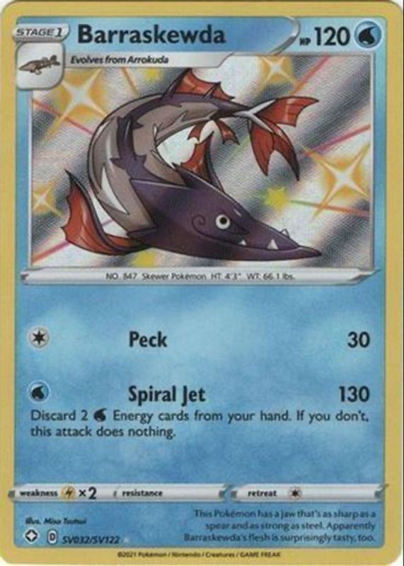 Barraskewda's Pokemon cards are available in at least 3 sets. Barraskewda's biggest 7-day price movers are 2021 Sword & Shield: Shining Fates #SV032 Shiny Rare, 2025 Japanese Scarlet & Violet: Glory of Team Rocket #030/098 Base, and 2025 Scarlet & Violet: Destined Rivals #063/182 Base.