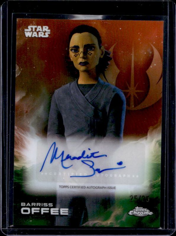 Barriss Offee's Star Wars cards are available in at least 6 sets. Barriss Offee's biggest 7-day price movers are 2025 Topps Chrome Star Wars #A-MSA Autographs - Rebel Orange Refractor /25, 2025 Topps Chrome Star Wars #A-MSA Autographs, and 2025 Topps Chrome Star Wars #A-MSA Autographs - Kashyyyk Green Refractor /99.