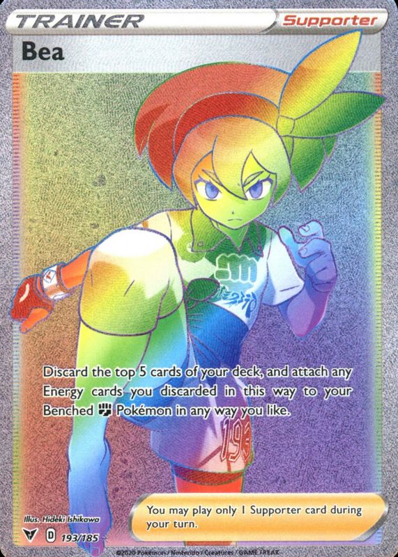 Bea's Pokemon cards are available in at least 3 sets. Bea's biggest 7-day price movers are 2020 Japanese Sword & Shield: Amazing Volt Tackle #109/100 Super Rare, 2020 Japanese Sword & Shield: Amazing Volt Tackle #116/100 Hyper Rare, and 2021 Japanese Sword & Shield: VMAX Climax #261/184 Super Rare (Full Art).