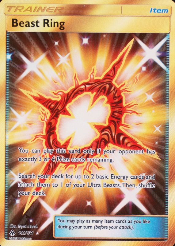 Beast Ring's Pokemon cards are available in at least 4 sets. Beast Ring's biggest 7-day price movers are 2018 Sun & Moon: Forbidden Light #141/131 Holo (Secret), 2019 Japanese Sun & Moon: Full Metal Wall #052/054 Trainer Rare, and 2018 Japanese Sun & Moon: GX Ultra Shiny #115/150 Base.