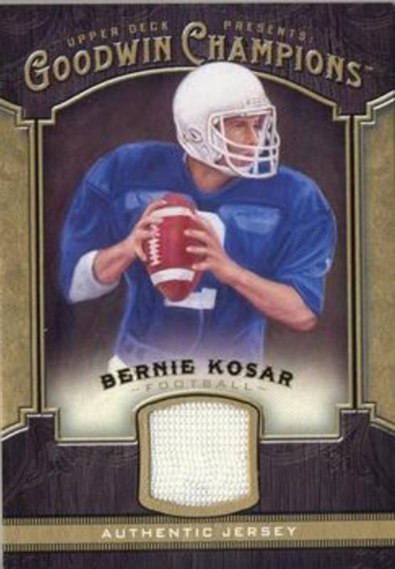 Bernie Kosar's Multi-Sport cards are available in at least 10 sets. Bernie Kosar's biggest 7-day price movers are 2014 Upper Deck Goodwin Champions #M-BK Memorabilia, 2014 Upper Deck Goodwin Champions #37 Mini Printing Plates Yellow /1, and 2014 Upper Deck Goodwin Champions #37 Mini Printing Plates Black /1.
