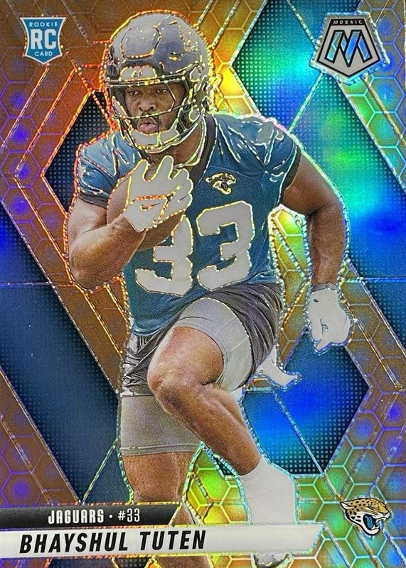 Bhayshul Tuten's Football cards are available in at least 28 sets. Bhayshul Tuten's biggest 7-day price movers are 2025 Prizm #305 Purple Ice /225, 2025 Select #29 Concourse Red /99, and 2025 Topps Chrome #389 Rookie.