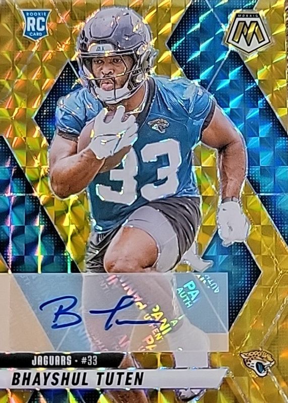Bhayshul Tuten's Football cards are available in at least 10 sets. Bhayshul Tuten's biggest 7-day price movers are 2025 Mosaic #385 Red & White Stripe, 2025 Mosaic #385 Genesis /(SSP), and 2025 Mosaic #385 Rookie Autographs - Gold /10.