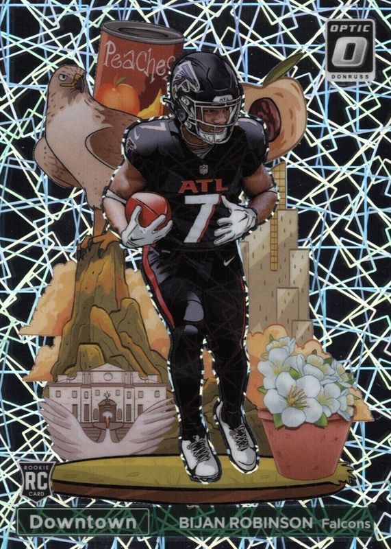 Bijan Robinson's Football cards are available in at least 76 sets. Bijan Robinson's biggest 7-day price movers are 2023 Mosaic #ND-9 NFL Debut - Reactive Yellow, 2023 Select #296 Club Level Silver Die-Cut, and 2023 Chronicles Draft Picks #9 Contenders Optic - Silver.