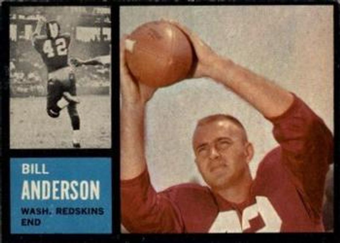 Bill Anderson's Football cards are available in at least 4 sets. Bill Anderson's biggest 7-day price movers are 1962 Topps #169 Base, 1961 Topps #127 Base, and 1960 Topps #126 Base.