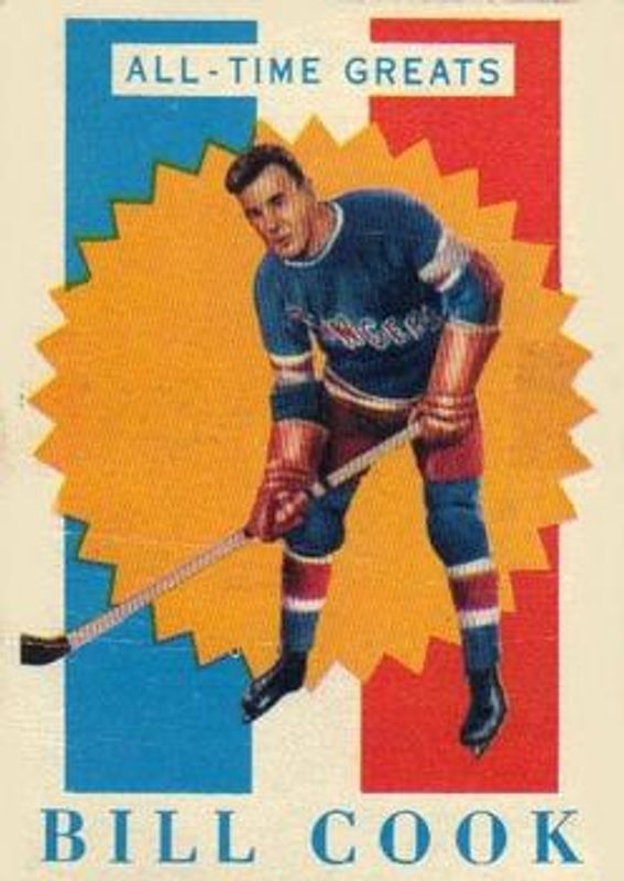 Bill Cook's Hockey cards are available in at least 13 sets. Bill Cook's biggest 7-day price movers are 1960 Topps #10 Base, 1933 World Wide Gum Ice Kings (V357) #30 English Only Back, and 1933 World Wide Gum Ice Kings (V357) #30 Base.