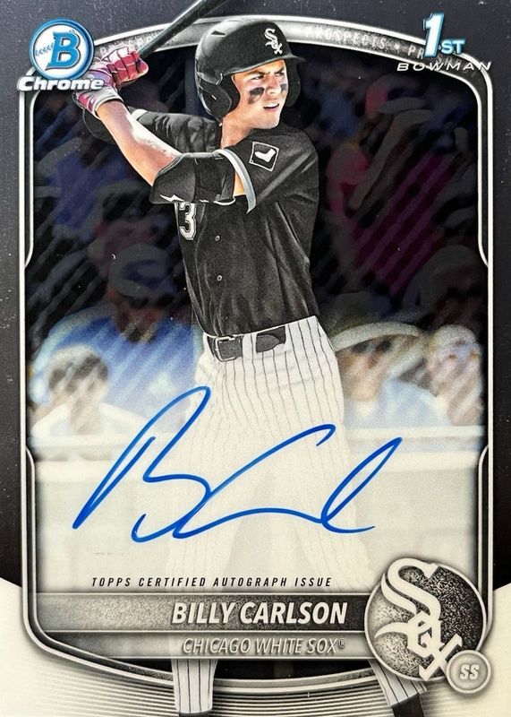 Billy Carlson's Baseball cards are available in at least 2 sets. Billy Carlson's biggest 7-day price movers are 2025 Bowman Draft Mega Box #BDC-10 Chrome - Blue Mega Refractor /150 (1st), 2025 Bowman Draft #BDC-10 Chrome - X-Fractor (1st), and 2025 Bowman Draft #BD-67 Sky Blue Border /499 (1st).