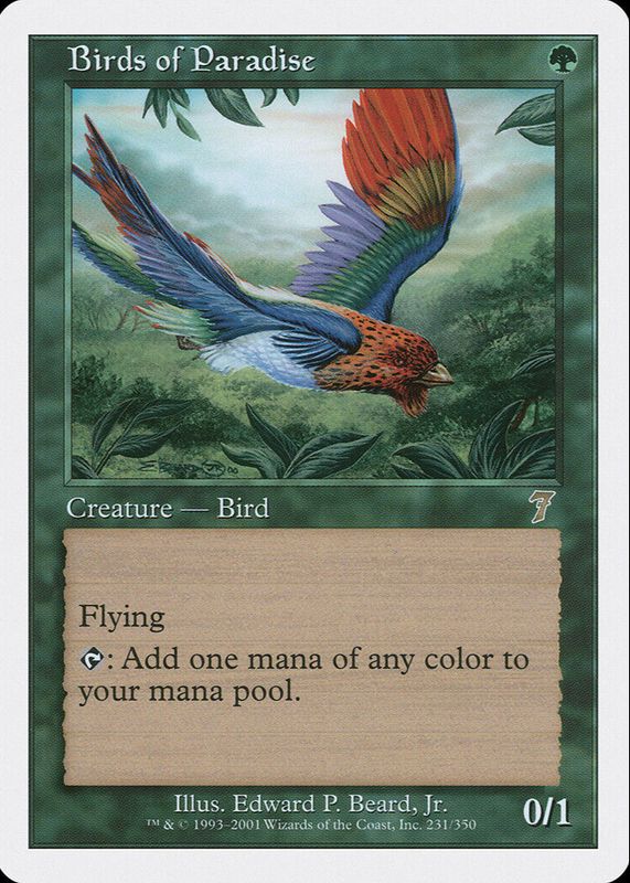 Birds of Paradise's Magic: The Gathering cards are available in at least 5 sets. Birds of Paradise's biggest 7-day price movers are 2001 Seventh Edition #231 Base, 1999 Sixth Edition #217 Base, and 1995 Fourth Edition Base.