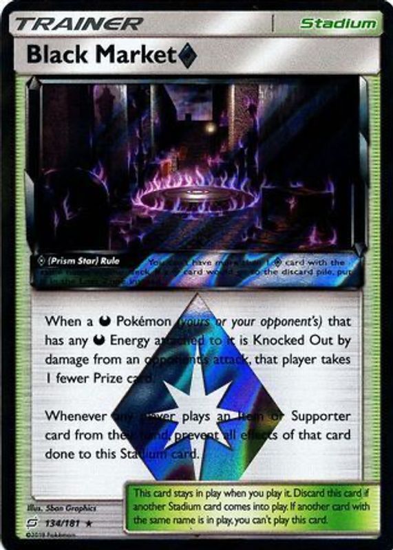 Black Market Prism Star's Pokemon cards are available in at least 2 sets. Black Market Prism Star's biggest 7-day price movers are 2019 Sun & Moon: Team Up #134/181 Holo, and 2018 Japanese Sun & Moon: Dark Order #052/052 Holo.