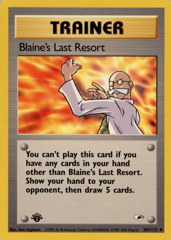 Blaine's Last Resort's Pokemon cards are available in at least 1 sets. Blaine's Last Resort's biggest 7-day price movers are 2000 Gym Heroes #105/132 1st Edition.