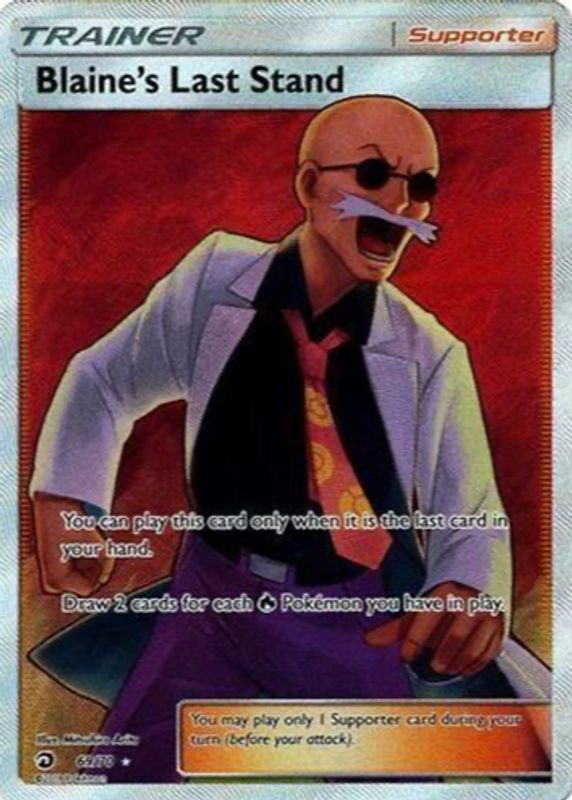 Blaine's Last Stand's Pokemon cards are available in at least 2 sets. Blaine's Last Stand's biggest 7-day price movers are 2018 Sun & Moon: Dragon Majesty #69/70 Holo (Full Art), 2019 Sun & Moon: Hidden Fates #52/68 Base, and 2019 Sun & Moon: Hidden Fates #52/68 Reverse Holo.