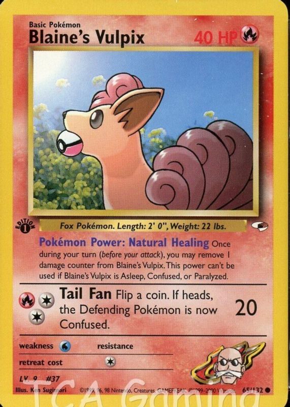 Blaine's Vulpix's Pokemon cards are available in at least 2 sets. Blaine's Vulpix's biggest 7-day price movers are 2000 Gym Challenge #066/132 1st Edition, and 2000 Gym Heroes #065/132 1st Edition.