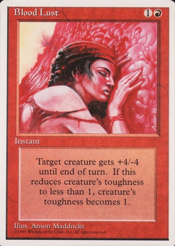 Blood Lust's Magic: The Gathering cards are available in at least 2 sets. Blood Lust's biggest 7-day price movers are 1995 Fourth Edition Base, and 1994 Legends Base.