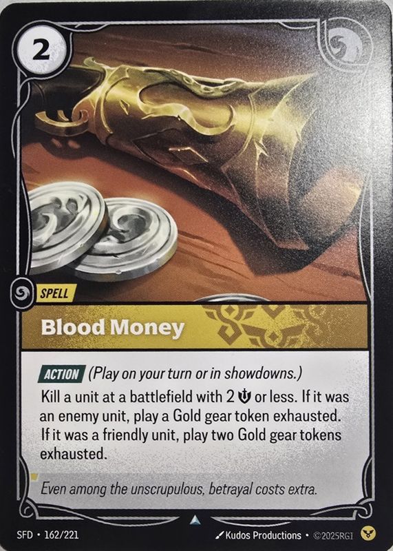 Blood Money's Riftbound cards are available in at least 1 sets. Blood Money's biggest 7-day price movers are 2026 Spiritforged #162/221 Base, and 2026 Spiritforged #162/221 Foil.