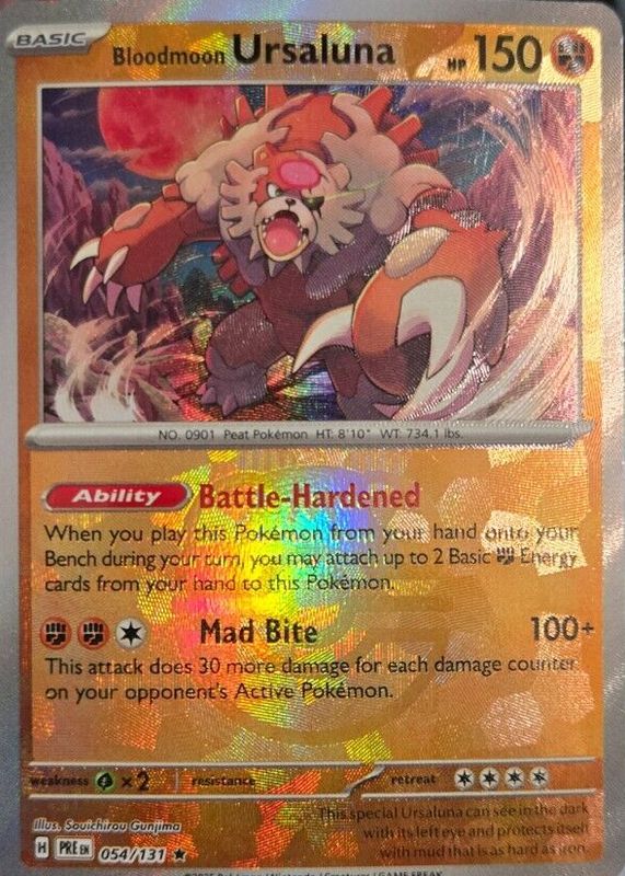 Bloodmoon Ursaluna's Pokemon cards are available in at least 4 sets. Bloodmoon Ursaluna's biggest 7-day price movers are 2025 Scarlet & Violet: Prismatic Evolutions #054/131 Holo, 2025 Scarlet & Violet: Prismatic Evolutions #054/131 Master Ball Reverse Holo, and 2024 Japanese Scarlet & Violet: Night Wanderer #025/064 Holo.