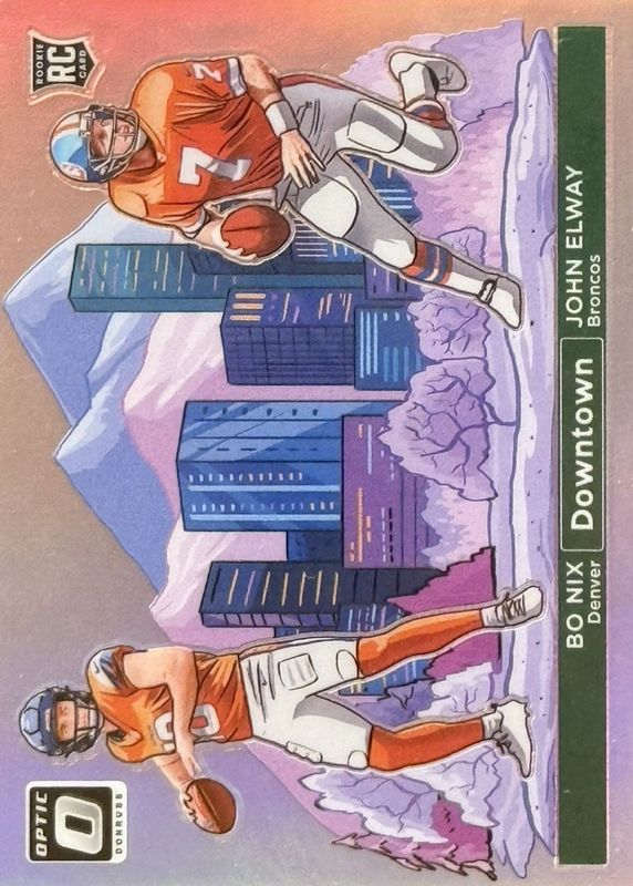 Bo Nix / John Elway's Football cards are available in at least 4 sets. Bo Nix / John Elway's biggest 7-day price movers are 2024 Optic #13 Downtown Duos /(SSP), 2024 Donruss #14 Downtown Horizontal /(SSP), and 2024 Donruss #14 Downtown Horizontal - Black /1.
