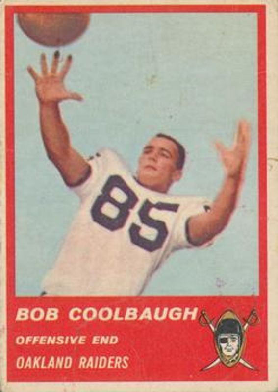 Bob Coolbaugh's Football cards are available in at least 3 sets. Bob Coolbaugh's biggest 7-day price movers are 1963 Fleer #60b Base, 1963 Fleer #60a Base, and 1961 Topps #189 Base.