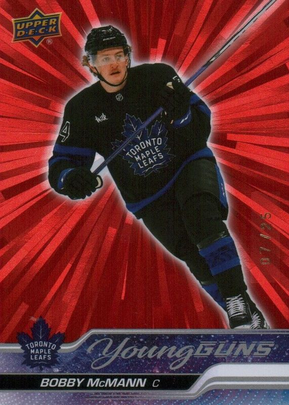 Bobby McMann's Hockey cards are available in at least 17 sets. Bobby McMann's biggest 7-day price movers are 2023 Upper Deck #479 Young Guns - Outburst Red /25, 2024 Upper Deck Allure #CFA-BM Color Flow Full Rainbow Auto, and 2024 Upper Deck Credentials #JI-BM Jumping on the Ice.