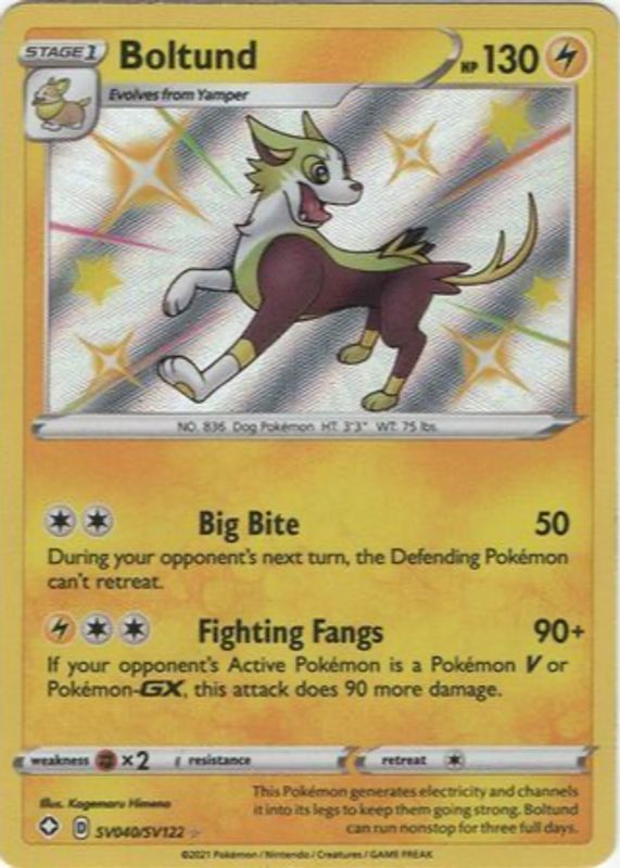 Boltund's Pokemon cards are available in at least 3 sets. Boltund's biggest 7-day price movers are 2021 Sword & Shield: Shining Fates #SV040 Shiny Rare, 2025 Japanese Mega: Inferno X #31/80 Base, and 2025 Mega Evolution: Phantasmal Flames #31/94 Reverse Holo.