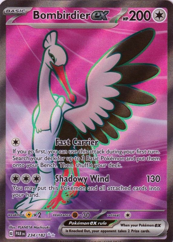 Bombirdier ex's Pokemon cards are available in at least 2 sets. Bombirdier ex's biggest 7-day price movers are 2023 Scarlet & Violet: Paradox Rift #234/182 Ultra Rare, 2023 Japanese Scarlet & Violet: Raging Surf #080/062 Super Rare, and 2023 Japanese Scarlet & Violet: Raging Surf #051/062 Double Rare.