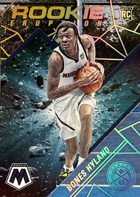 Bones Hyland's Basketball cards are available in at least 61 sets. Bones Hyland's biggest 7-day price movers are 2021 Mosaic #2 Rookie Eruption /(SSP), 2021 Optic #194 Pink Velocity /79, and 2022 Obsidian #MS-BHA Magmatic Signatures - Electric Etch Purple /75.