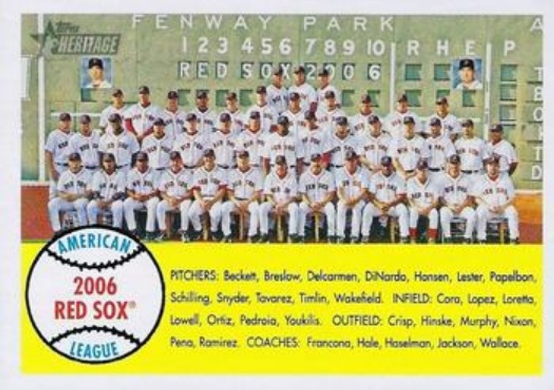 Boston Red Sox,,'s Baseball cards are available in at least 4 sets. Boston Red Sox,,'s biggest 7-day price movers are 2007 Topps Heritage #312 Base, 2010 Topps Heritage #373 Base, and 2011 Topps Heritage #334 50th Anniversary Buybacks.