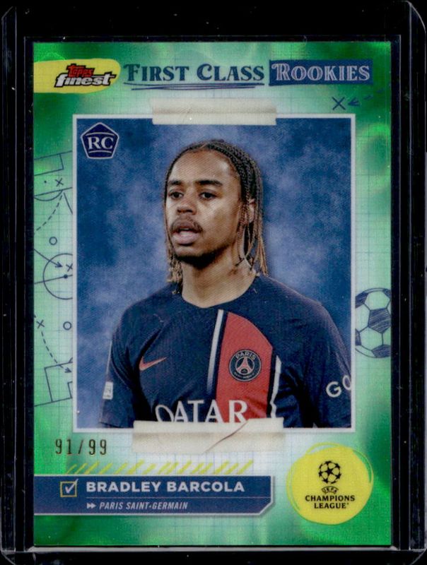 Bradley Barcola's Soccer cards are available in at least 45 sets. Bradley Barcola's biggest 7-day price movers are 2023 Topps Finest UEFA Club Competitions #FR-9 Finest First Class Rookies - Green Lava /99, 2023 Topps Finest UEFA Club Competitions #TM-16 The Man - Superfractor /1, and 2023 Topps UEFA Club Competitions Superstars #180 Legendary Red Wave Chrome /5.