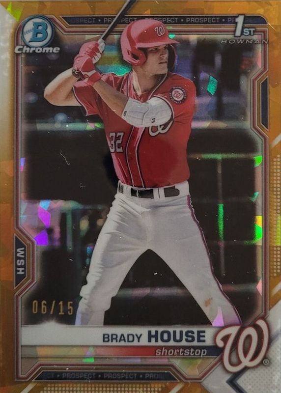 Brady House's Baseball cards are available in at least 23 sets. Brady House's biggest 7-day price movers are 2021 Bowman Draft Sapphire Edition #BDC-186 Chrome - Gold /15 (1st), 2021 Bowman Draft Sapphire Edition #BDC-186 Chrome - Green /50 (1st), and 2022 Bowman Chrome #CPA-BH Prospect Auto - Superfractor /1.
