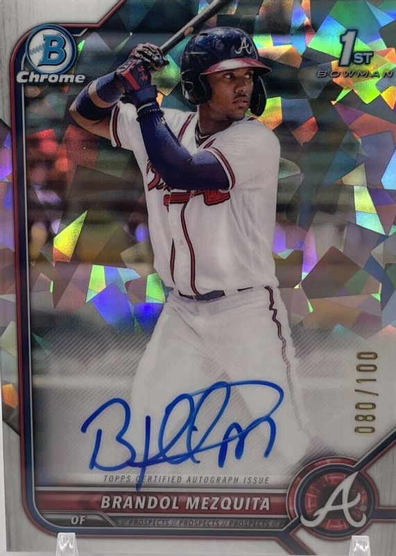 Brandol Mezquita's Baseball cards are available in at least 1 sets. Brandol Mezquita's biggest 7-day price movers are 2022 Bowman Chrome #CPA-BMQ Prospect Auto - Atomic Refractor /100 (1st), 2022 Bowman Chrome #CPA-BMQ Prospect Auto - Speckle Refractor /299 (1st), and 2022 Bowman Chrome #CPA-BMQ Prospect Auto - Green Atomic Refractor /99 (1st).