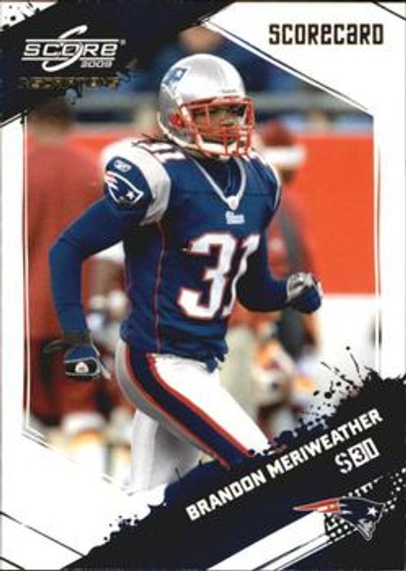 Brandon Meriweather's Football cards are available in at least 12 sets. Brandon Meriweather's biggest 7-day price movers are 2009 Score Inscriptions #171 Scorecard /50, 2009 Score Inscriptions #171 Autographs /99, and 2009 Score Inscriptions #171 Base /999.