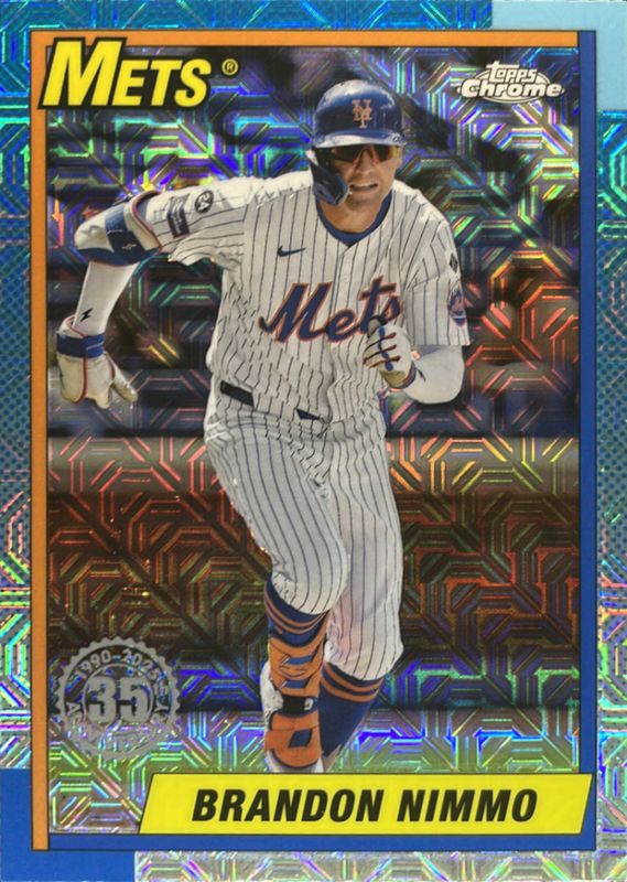 Brandon Nimmo's Baseball cards are available in at least 61 sets. Brandon Nimmo's biggest 7-day price movers are 2025 Topps #T90C-61 1990 Baseball Chrome Silver Pack, 2025 Topps #T90C-61 1990 Baseball Chrome Silver Pack - Black Refractor /10, and 2025 Topps #90CA-BN 1990 Baseball Chrome Silver Pack Autographs (Series 1) - Gold Refractor /50.