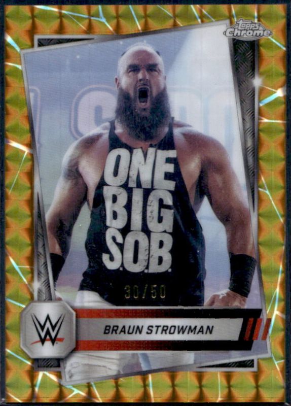 Braun Strowman's Wrestling cards are available in at least 50 sets. Braun Strowman's biggest 7-day price movers are 2025 Topps Chrome WWE #158 Gold Geometric Refractor /50, 2025 Topps Chrome WWE #158 Purple Refractor, and 2025 Topps Chrome WWE #158 Sepia Refractor.
