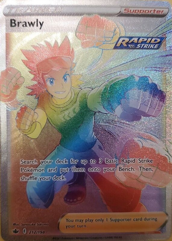 Brawly's Pokemon cards are available in at least 2 sets. Brawly's biggest 7-day price movers are 2021 Sword & Shield: Chilling Reign #212/198 Holo (Secret), 2021 Sword & Shield: Chilling Reign #188/198 Holo (Full Art), and 2021 Japanese Sword & Shield: Peerless Fighters #69/70 Base.