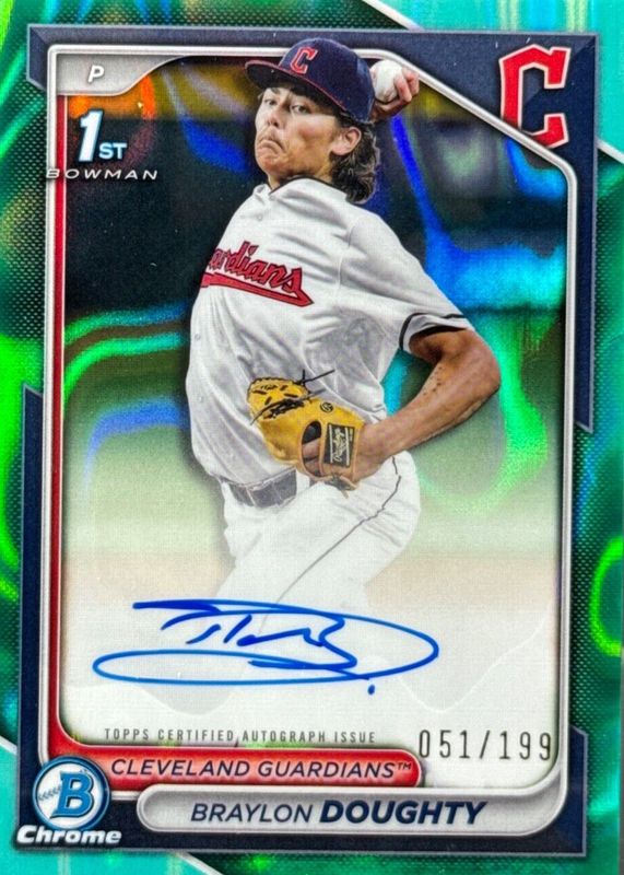 Braylon Doughty's Baseball cards are available in at least 7 sets. Braylon Doughty's biggest 7-day price movers are 2024 Bowman Draft #CPA-BD Chrome Prospect Auto - Blue Refractor /150 (1st), 2024 Bowman Draft #CPA-BD Chrome Prospect Auto - Aqua Lava Refractor /199 (1st), and 2024 Bowman Draft #CPA-BD Chrome Prospect Auto - Green Refractor /99 (1st).