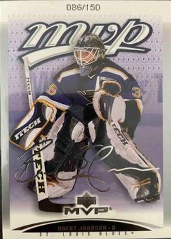 Brent Johnson's Hockey cards are available in at least 76 sets. Brent Johnson's biggest 7-day price movers are 2003 Upper Deck MVP #373 Silver Script /150, 2003 Upper Deck MVP #373 Base, and 2003 Upper Deck MVP #373 Gold Script /25.