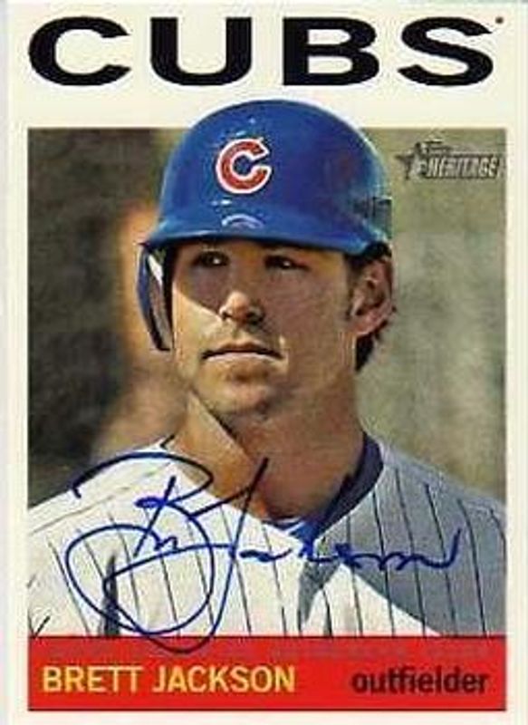 Brett Jackson's Baseball cards are available in at least 2 sets. Brett Jackson's biggest 7-day price movers are 2013 Topps Heritage #ROA-BJ Real One Autographs, 2013 Topps Heritage #ROA-BJ Real One Autographs - Red Ink /64, and 2013 Topps Heritage #49 Venezuelan.