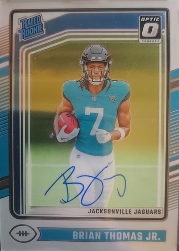 Brian Thomas Jr.'s Football cards are available in at least 64 sets. Brian Thomas Jr.'s biggest 7-day price movers are 2024 Mosaic #282 NFL Debut - Red Sparkle /(SSP), 2024 Optic #214 Purple Shock, and 2024 Prizm #314 Red White Blue.