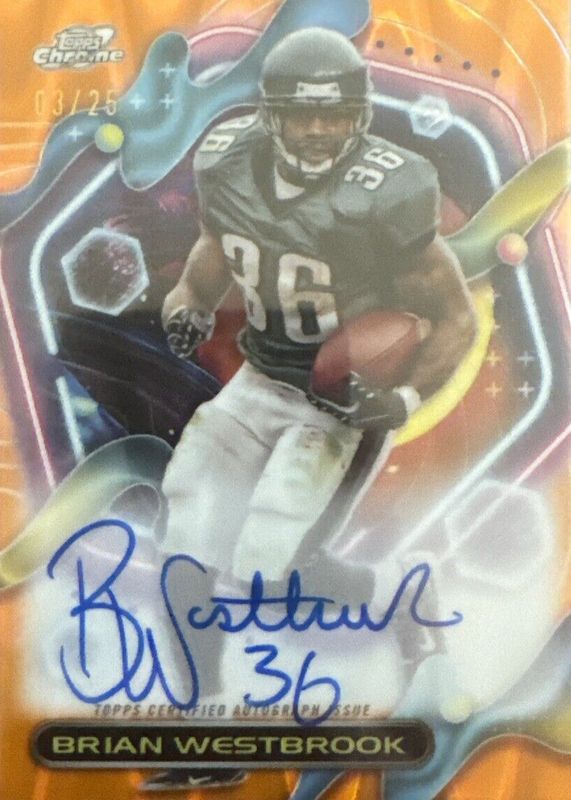 Brian Westbrook's Football cards are available in at least 36 sets. Brian Westbrook's biggest 7-day price movers are 2023 Topps Composite #CCA-BW Cosmic Autographs - Orange Galactic /25, 2023 Topps Composite #CCA-BW Cosmic Autographs - Superfractor /1, and 2023 Topps Composite #CCA-BW Cosmic Autographs - Red Flare /5.