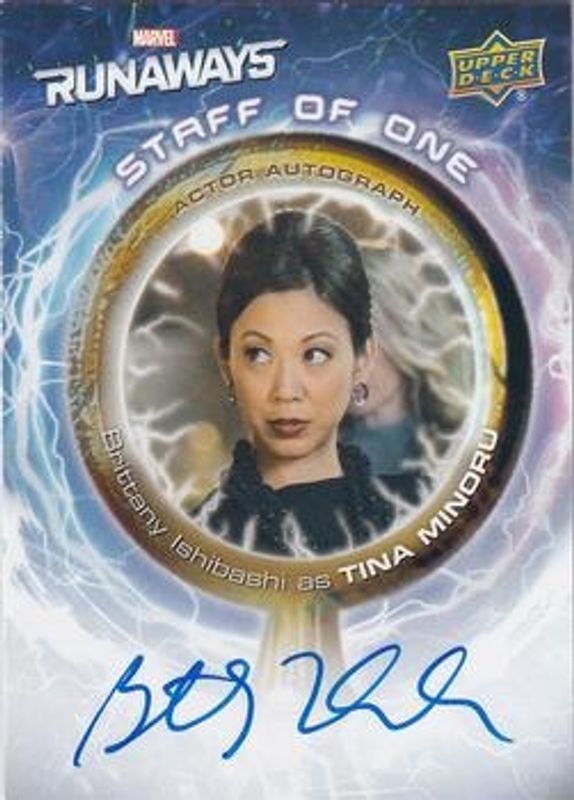 The biggest 30-day change Brittany Ishibashi cards are 2020 Upper Deck Marvel's Runaways #SOO-BI The Staff of One Autographs, 2020 Upper Deck Marvel's Runaways #SOO-BI The Staff of One Autographs Inscriptions, and 2020 Upper Deck Marvel's Runaways #R#1-BI #1 Photo Variant Autographs /50.