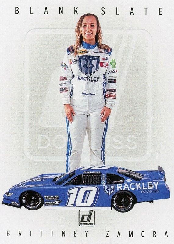 Brittney Zamora's Racing cards are available in at least 20 sets. Brittney Zamora's biggest 7-day price movers are 2022 Donruss NASCAR #BS-BZ Blank Slate /(SSP), 2025 Donruss NASCAR #BRM-BZA Burning Rubber Materials - Platinum /1, and 2025 Donruss NASCAR #BRM-BJA Burning Rubber Materials - Red /99.