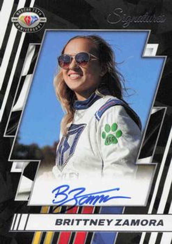 Brittney Zamora's Racing cards are available in at least 21 sets. Brittney Zamora's biggest 7-day price movers are 2023 Panini Prime #75-BZ NASCAR 75th Anniversary Signatures, 2023 Panini Prime #PJ-BZA Prime Jumbo Associate Sponsor 2 /1, and 2023 Panini Prime #PJ-BZA Prime Jumbo Associate Sponsor 1 /1.