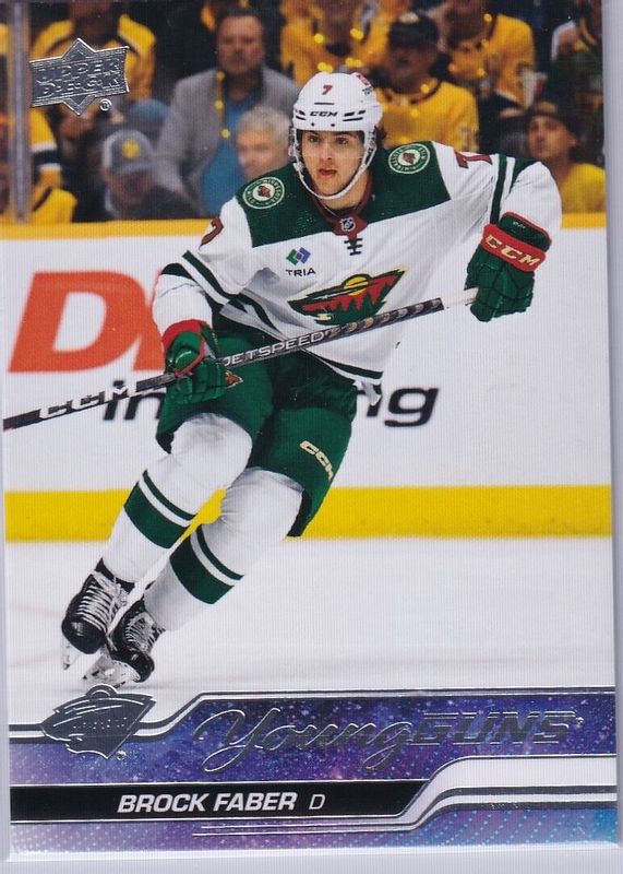 Brock Faber's Hockey cards are available in at least 30 sets. Brock Faber's biggest 7-day price movers are 2023 Upper Deck #215 Young Guns Base, 2023 Upper Deck #215 Young Guns - Outburst Silver, and 2023 SP Authentic #109 Future Watch Auto /999.